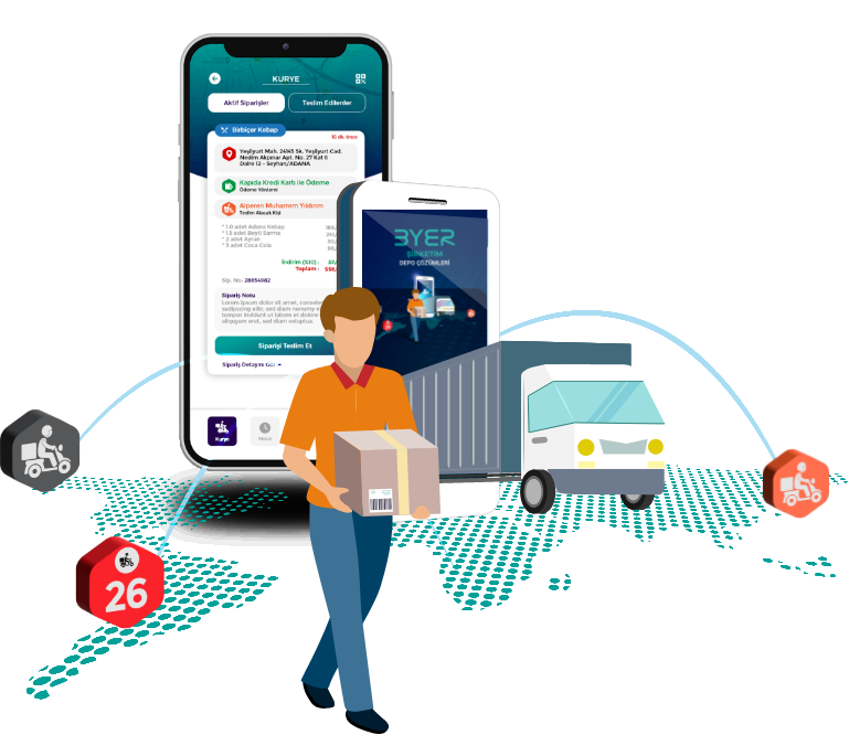 Kurye Takip Sistemi, kuryelerinizin konumlarını anlık olarak harita üzerinde izlemenizi ve teslimat süreçlerinizi kolayca yönetmenizi sağlar. Entegrasyon desteğimiz sayesinde, Desenpos, Adisyo POS, Vega POS, Winsell POS ve Mobres gibi popüler sistemlerle uyum sağlıyoruz. Bu sayede müşteri adresleri ve restoranlar harita üzerinde gösterilir; kuryeler siparişlerini rahatça görüp, adreslere hızlıca ulaşabilir ve gerektiğinde müşteriyi arayarak teslimatı hızlıca gerçekleştirir.